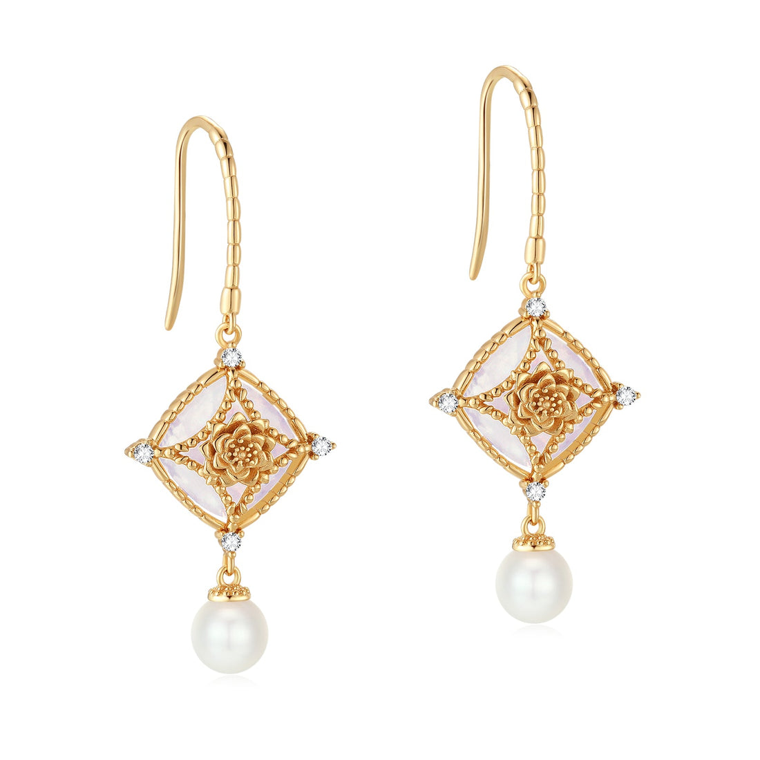 Moonstone & Freshwater Pearl Gold Earrings - Water Lily