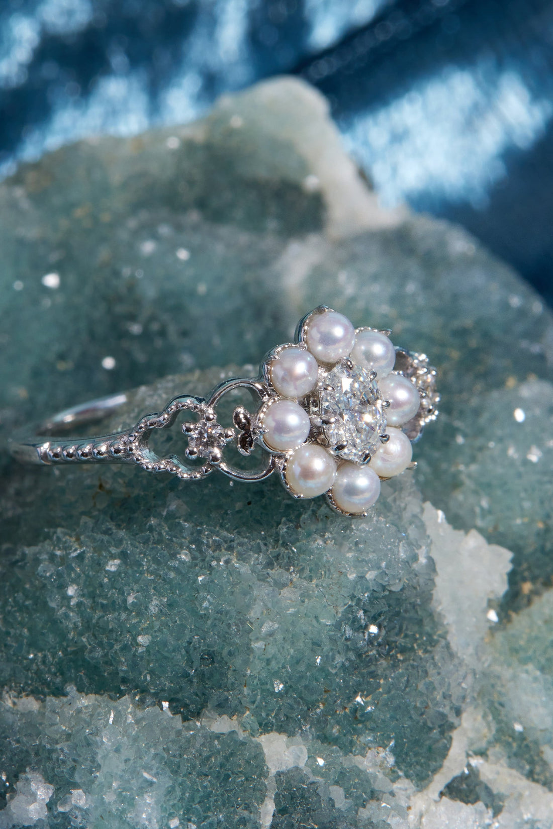 This ring embodies the delicate allure of a soft pearl's glow and the captivating sparkle...