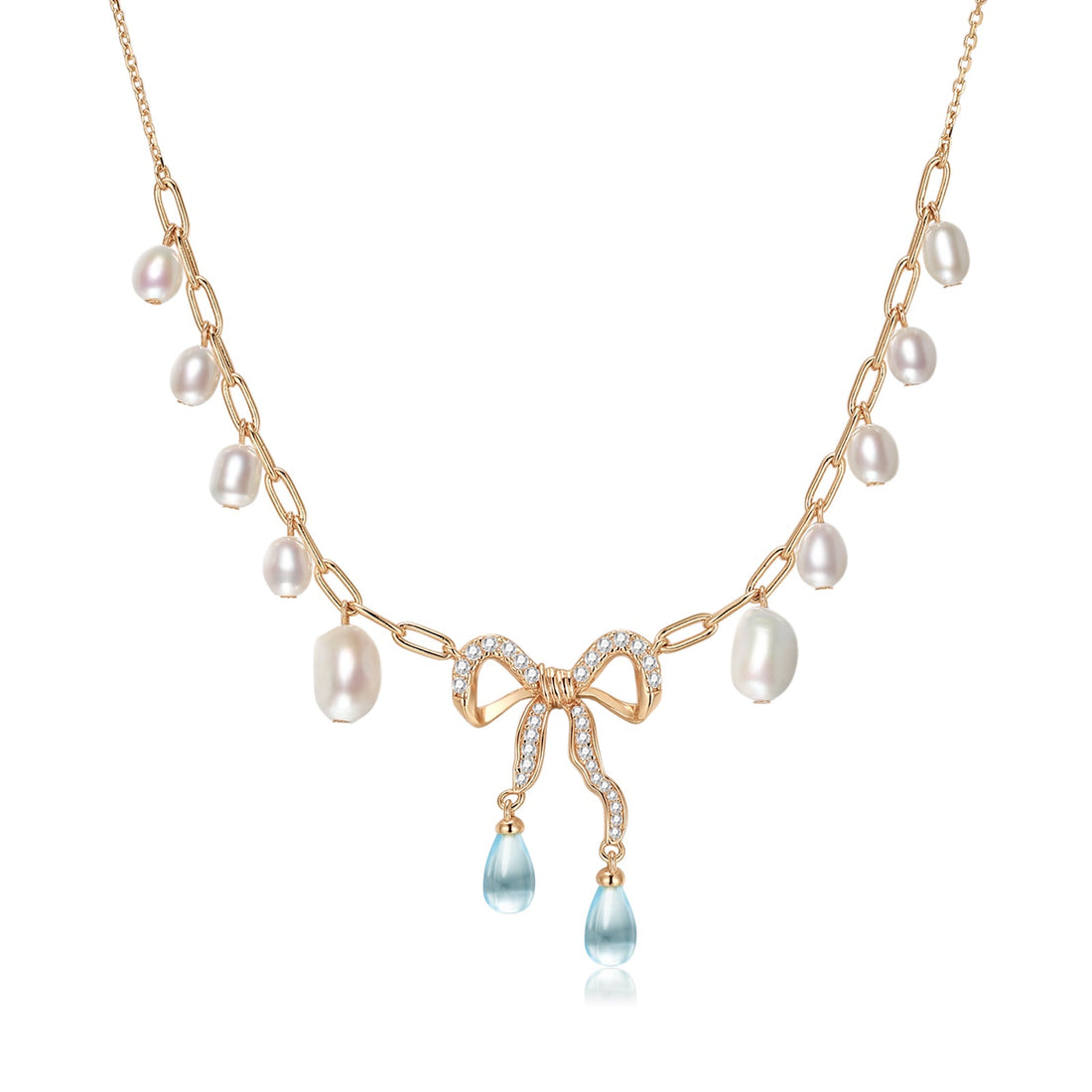 Blue Topaz & Pearl Gold Bow Dangle Necklace - Alice