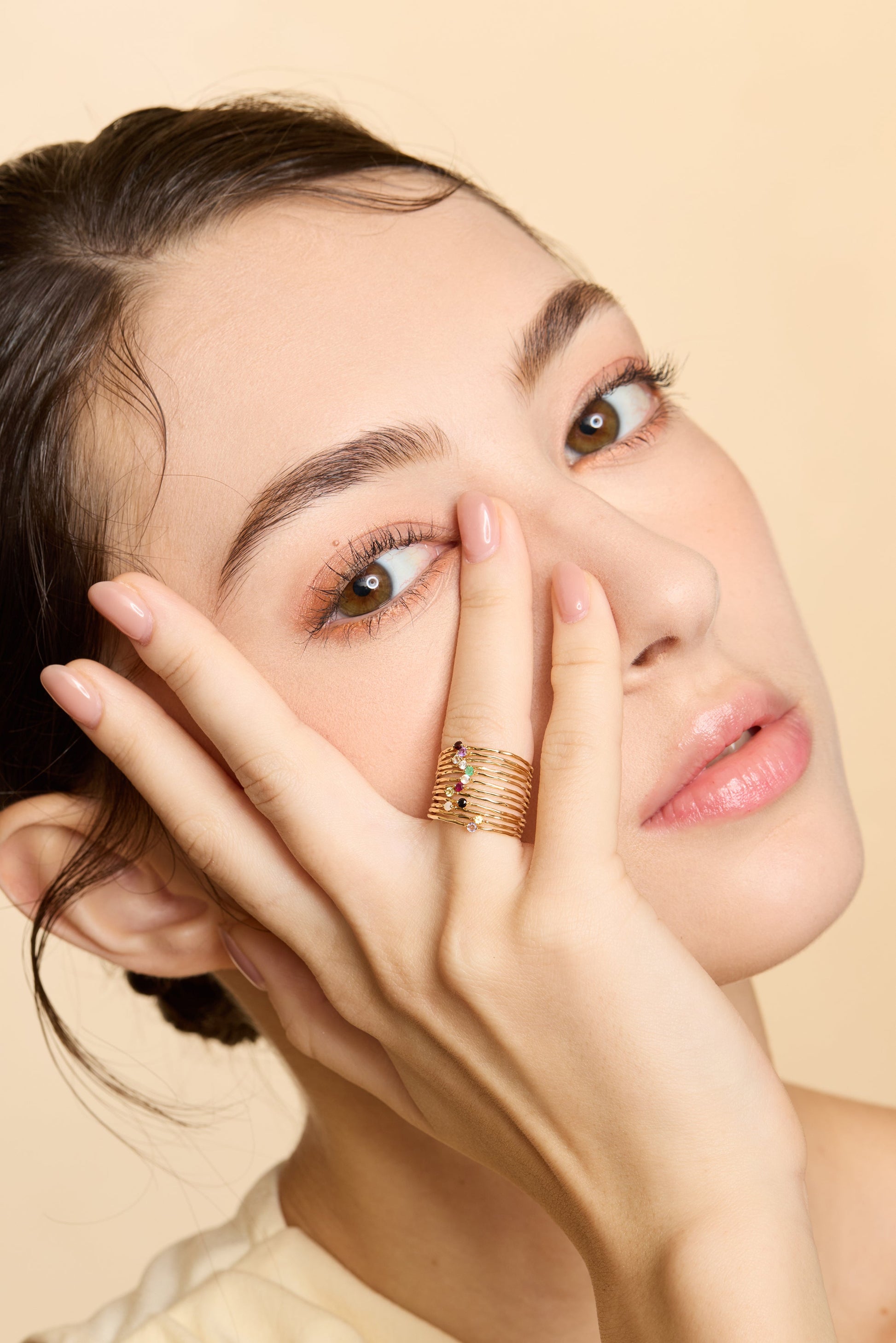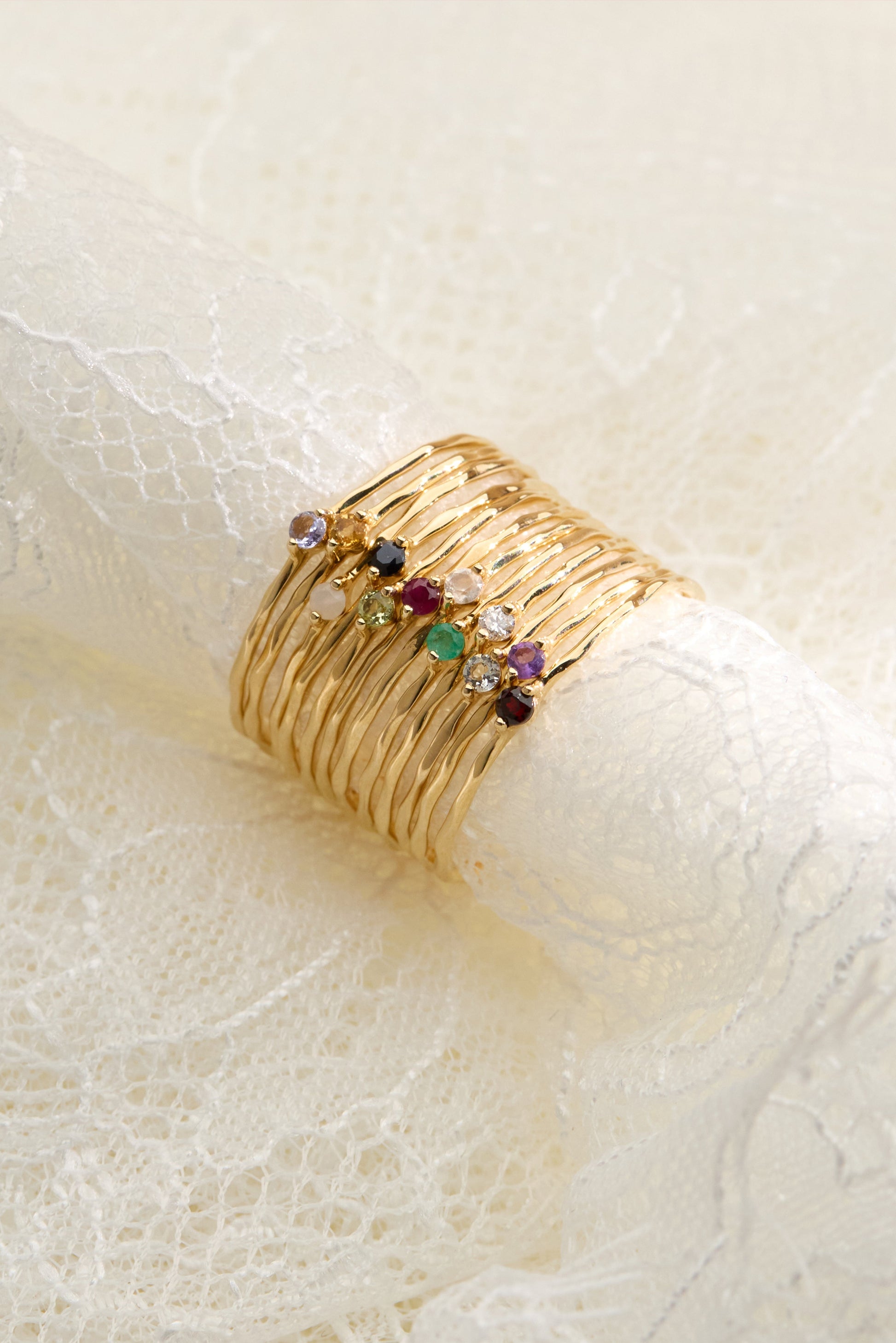 Delicately crafted in 14K gold, this dainty birthstone ring features a hammered texture and a lightweight design. Centrally set with your personal birthstone, it serves as a personal talisman, bringing you gentle whispers of good luck, protection, and blessings. Stack it with the birthstones of your loved ones to transform your jewelry into a personal keepsake of love.