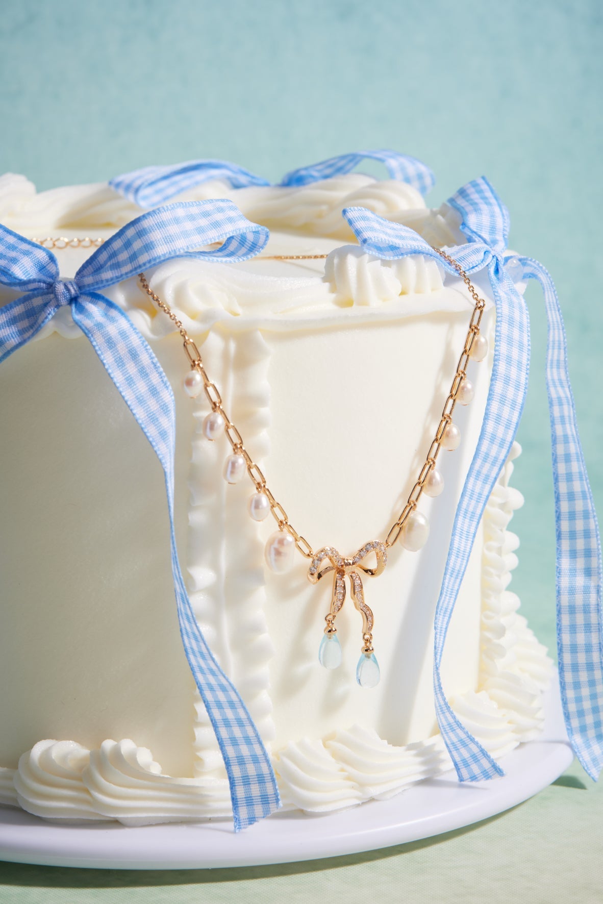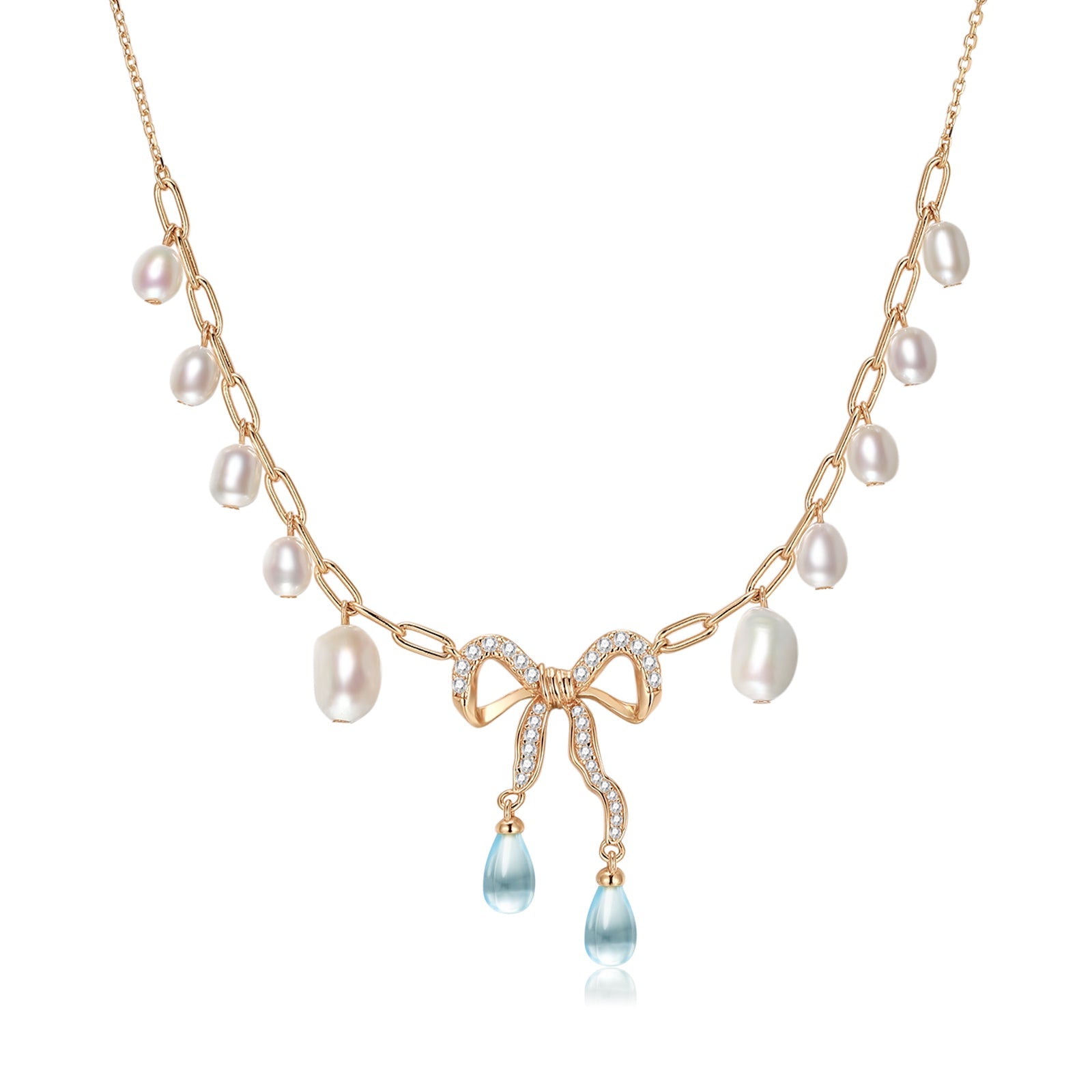Blue Topaz & Pearl Gold Bow Dangle Necklace - Alice