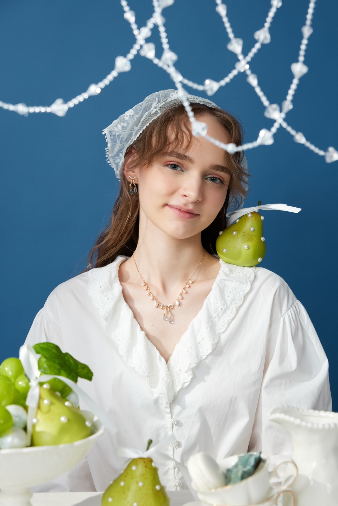 This exquisitely crafted bow necklace beautifully captures the graceful flow of a delicate ribbon. The centerpiece is a glittery ribbon bow dangled with 2 teardrop blue topazes. Encircling the necklace are 10 dainty pearls, each radiating a captivating luminosity around the neck. This necklace exudes a mesmerizing and alluring presence, perfect for adding a touch of sophistication to any occasion.