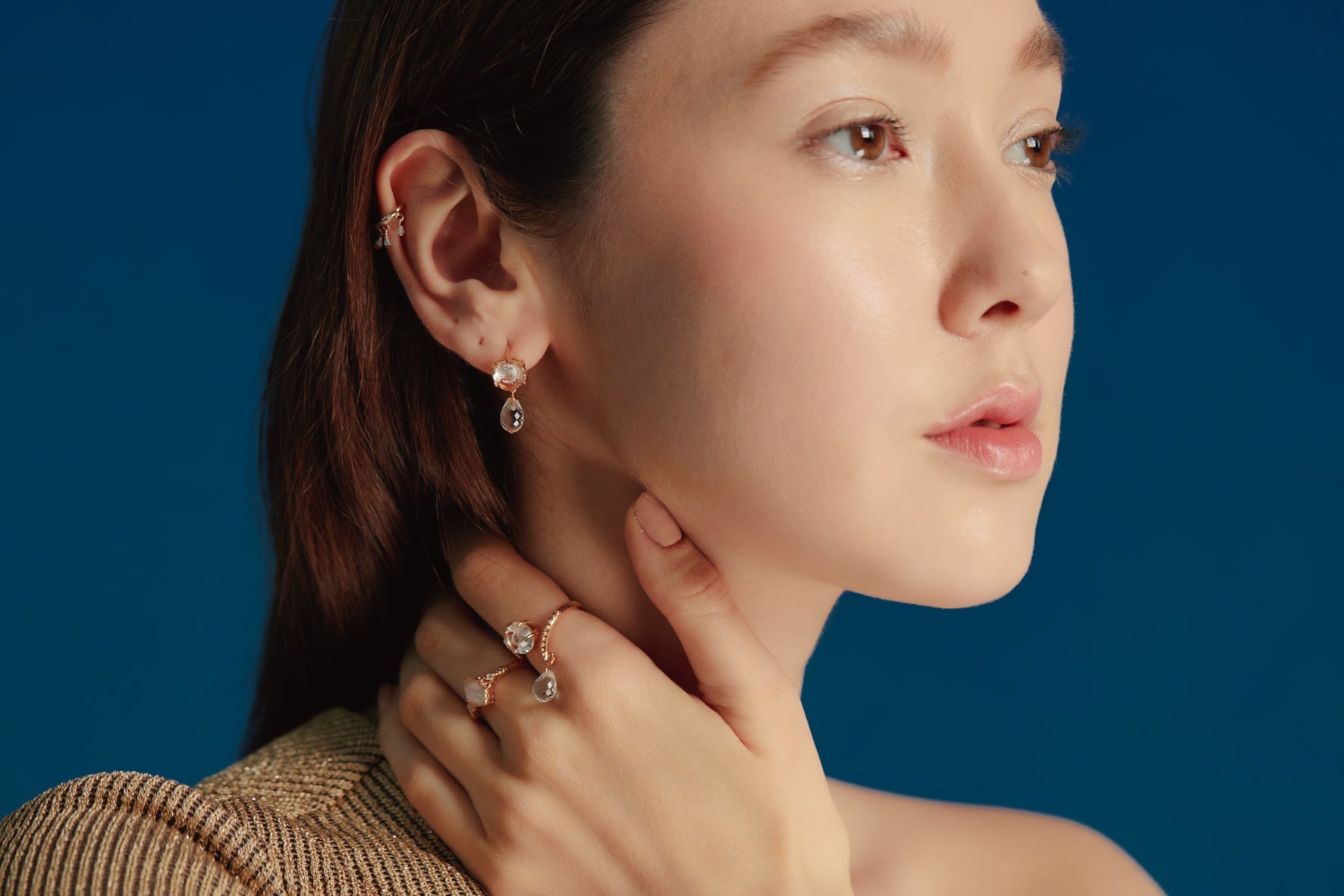 Elevate your style with these enchanting earrings, featuring a transparent clear quartz adorned with a delicate crescent moon motif, evoking the serene beauty of a starry night sky. A faceted teardrop clear quartz dangles gracefully, capturing the light of distant stars and sparkling with every movement.