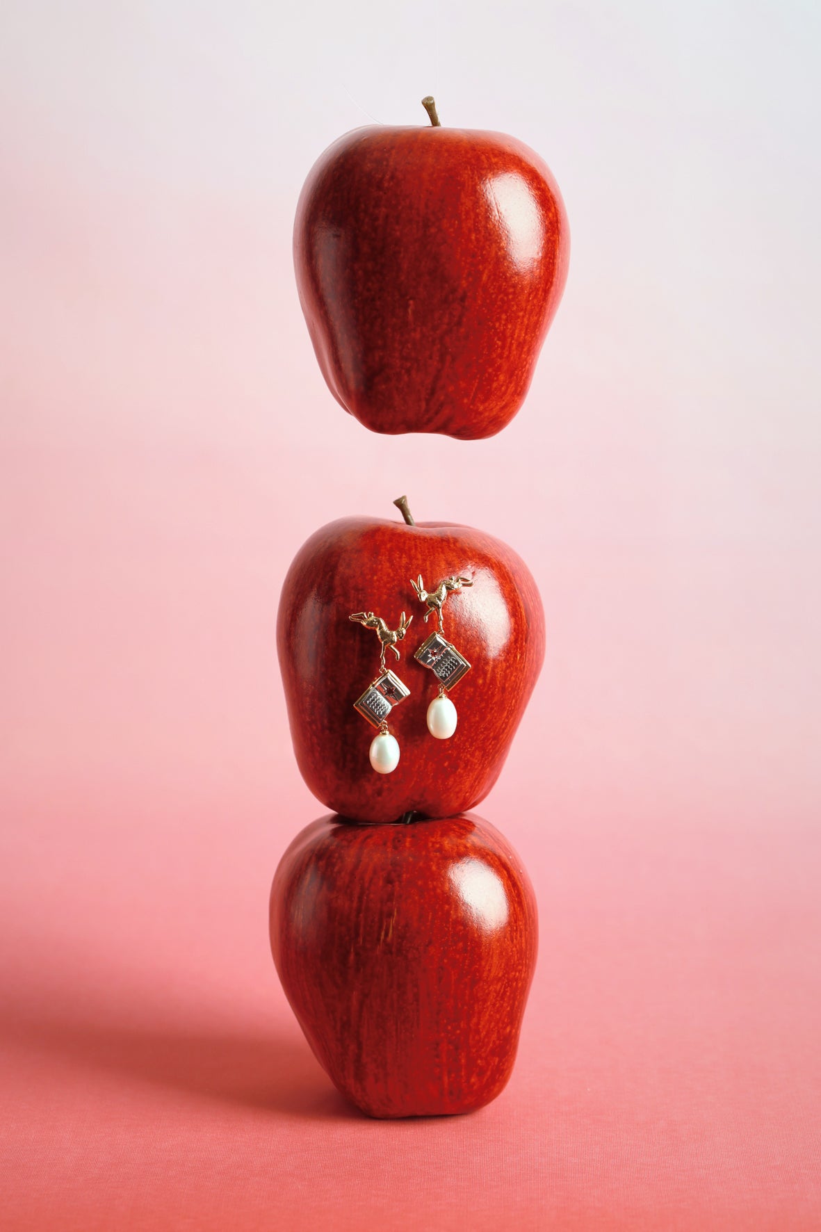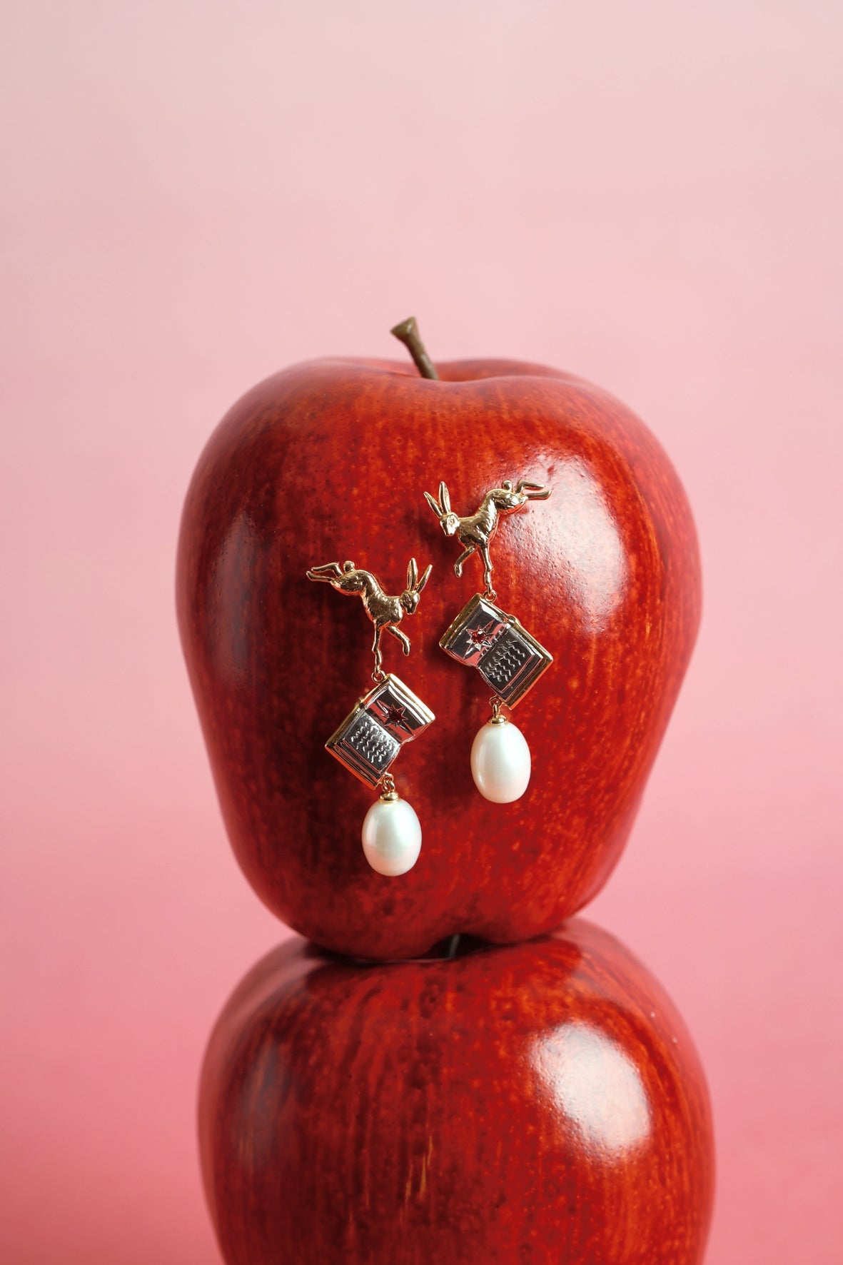 These earrings are exquisitely adorned with two luminous pearls, dangling from enchanting storybooks, held by two charming leaping rabbits that invite you to jump into a rabbit hole and explore a world of wonder. Embrace the magic of the unknown and elevate your style with this imaginative pair of earrings, offering a delightful escape from the ordinary.