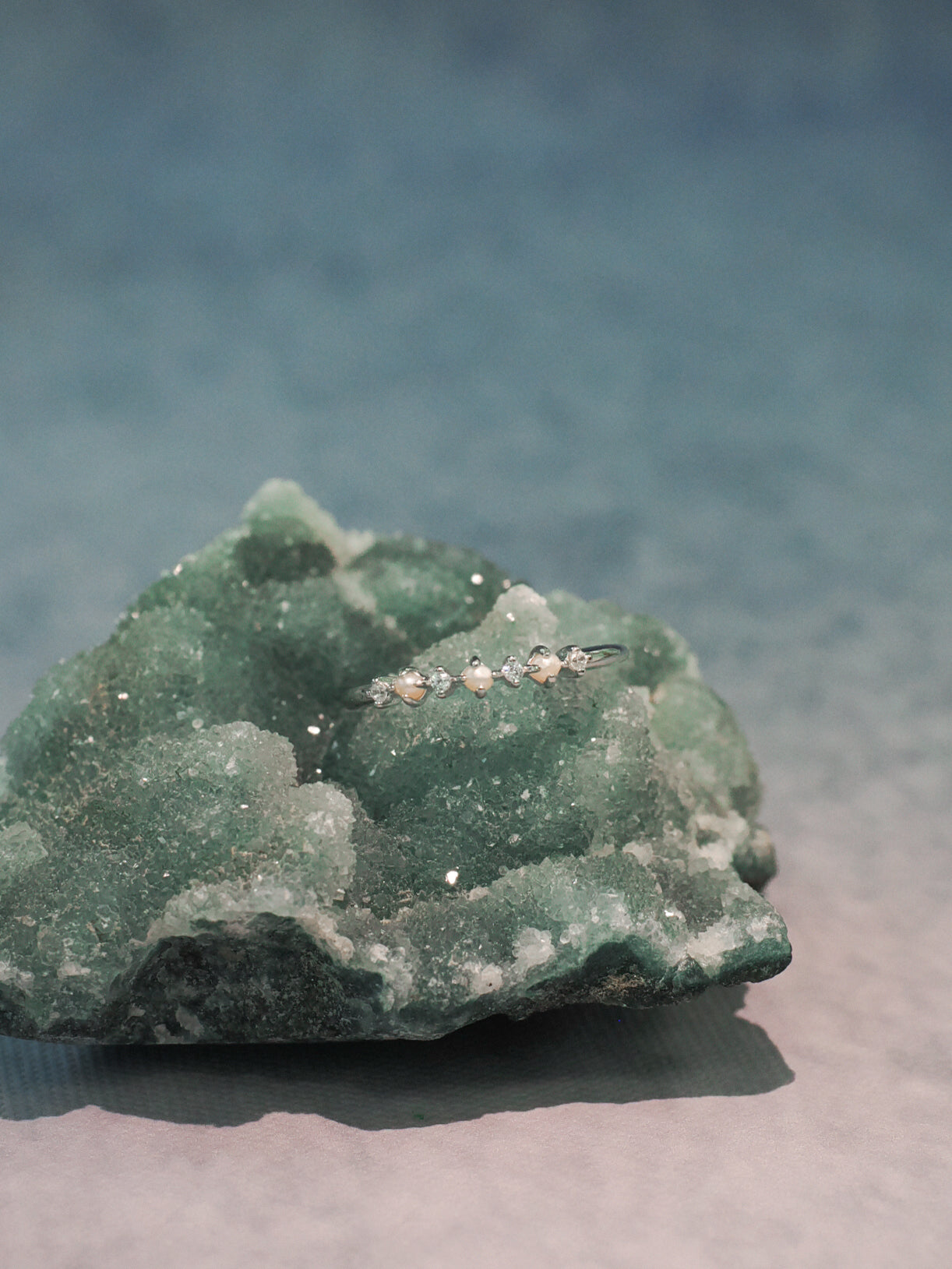 This dainty ring is delicately adorned with luminous freshwater pearls that symbolize purity and healing, along with two glistening CZ stones that complement the pearls with their subtle shimmer. Adorn your finger with a touch of elegance and grace.