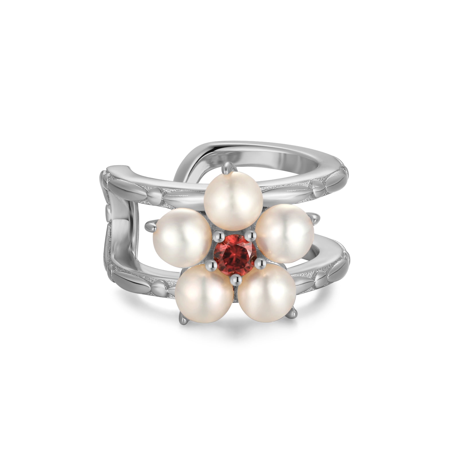This exquisite ear cuff showcases delicate flower petals crafted from lustrous freshwater pearls, each exudes timeless beauty and unique luster. At its center lies a captivating red cubic zirconia, adding vibrant color and drawing the eye to its intricate details. How to wear: Securely and comfortably place the ear cuff over the thinnest part of the ear cartilage. *Note that this ear cuff is designed for helixes, not for ears without a fold or helix.