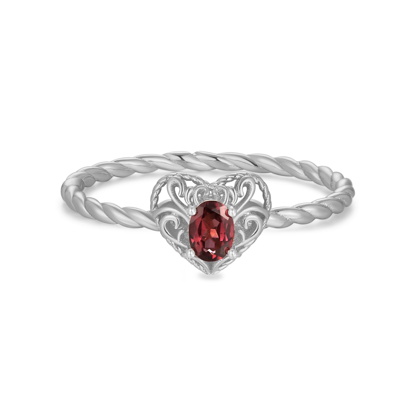 The January birthstone Garnet is often associated with love, passion, and protection. This exquisite ring is crafted in a heart-shaped design, evoking a sense of timeless romance. Delicate cut-out filigree flower details dance across its surface, artfully inspired by the regal essence of Queen of Hearts and the serene charm of a blooming flower garden.