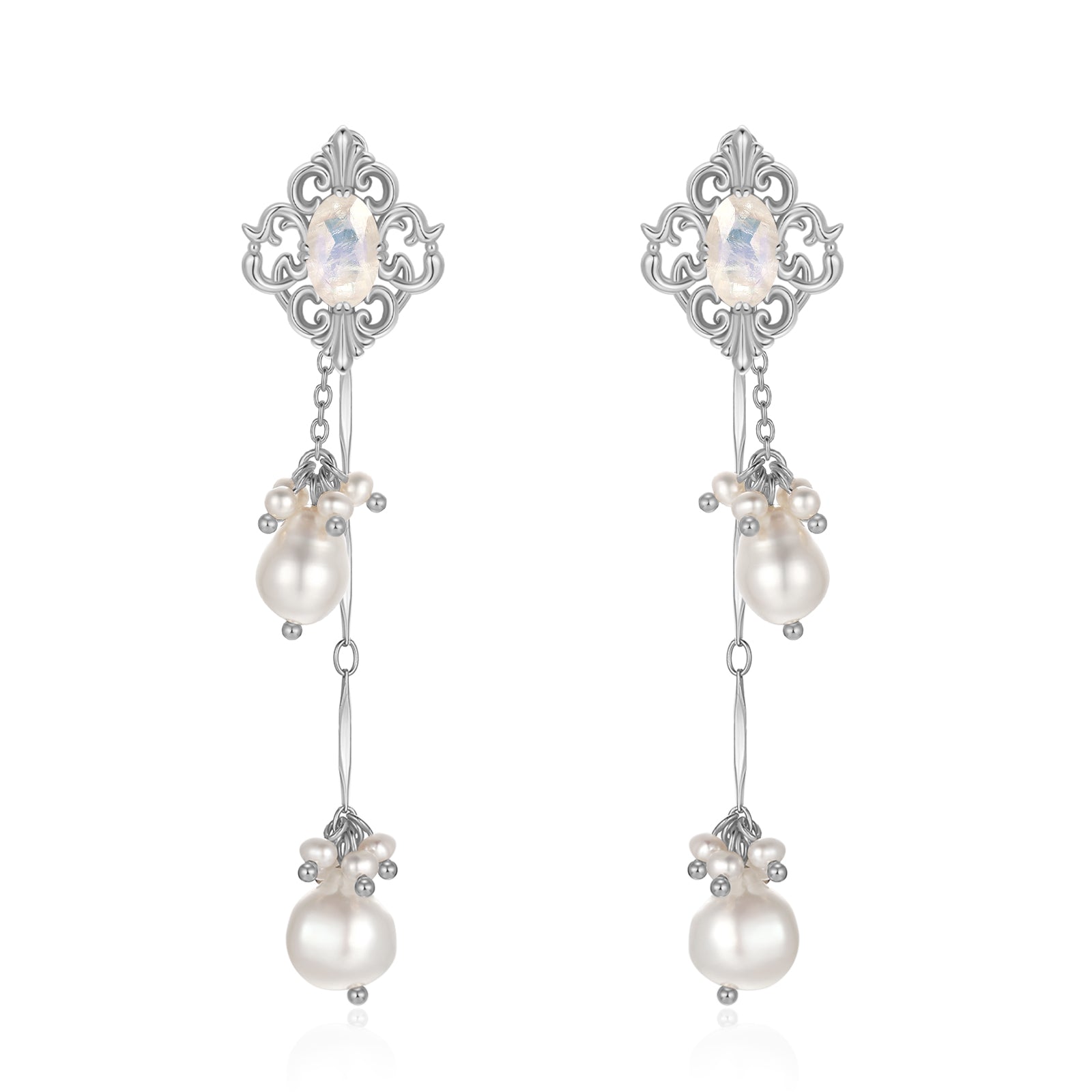 At the center lies a luminous oval moonstone, and gracefully dangled with baroque pearls, capturing the essence of serene beauty. These June's birthstones are symbols of new beginnings, inspiration, intuition, and love, illuminating your path as you step into a new chapter of life.