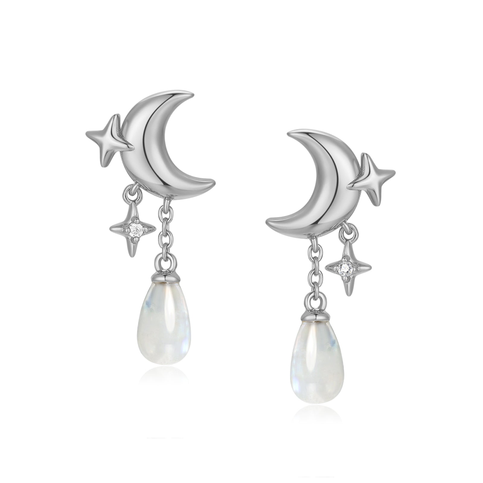 Elevate your style and embrace the allure of the cosmos with these exquisite earrings, featuring a delicate moon and star design and adorned with a stunning teardrop moonstone. They sway and sparkle with each gentle movement, infusing your look with timeless elegance.